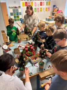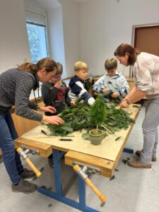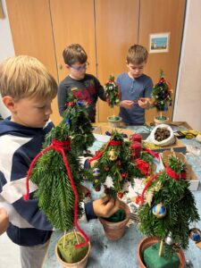 In der dritten Klasse wurde es in den vergangenen Tagen besonders festlich: Gemeinsam mit einigen engagierten Mamas stellten die Kinder nicht nur ihren eigenen Adventkranz her, sondern gestalteten auch liebevoll geschmückte Christbäume aus Tannenreisig und funkelnder Christbaumdekoration.