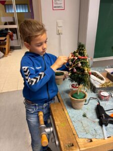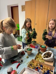 Mit großer Begeisterung wurde geschnitten, gebunden, dekoriert und ausprobiert. Die Kinder waren mit Freude bei der Sache und konnten am Ende voller Stolz ihre selbst gefertigten Christbäume präsentieren.